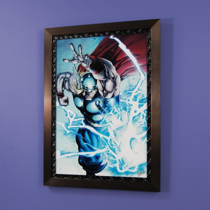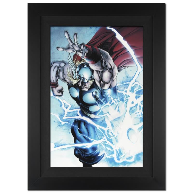 A piece of comic book history, this limited edition, from original art by Stephen Segovia, depicts a heroic Thor. Stephen Segovia is a comic book artist, illustrator, graphic and concept designs artist, specializing in comic book illustrations. He is currently working on Wolverine Origins for Marvel Comics, Hired Assassins, and A Gun Runner. He has also worked on such titles as Silver Surfer, Mighty Avengers, and Amazing Spider-Man. "Marvel Adventures Super Heroes #19" is an extremely limited edition giclee on canvas by Stephen Segovia presented by Marvel Comics, hand signed by the great Stan Lee and numbered out of only 10! This piece comes custom framed and ready to hang. Includes Certificate of Authenticity! Measures approx. 25" x 34" (with frame), 18" x 27" (image).