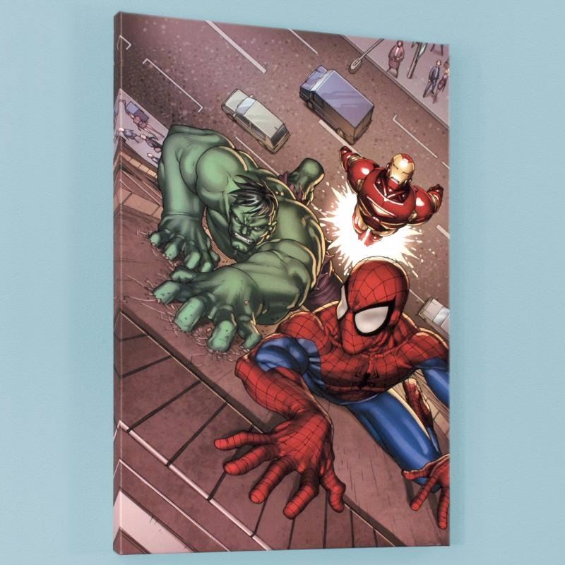 A piece of comic book history, this limited edition, from original art by Roger Cruz, depicts Spider-Man, Hulk, and Iron Man. Cruz started his professional career as a letterer for a Brazilian publishing house; then worked as a writer and art assistant for a short-lived black and white comics magazine. When Art & Comics Studio first introduced Brazilian artists to the American comic book market, he was given the opportunity to work as an artist for Marvel Comics on the titles Ghost Rider, Hulk, X-Men Avengers: Timeslide and Silver Surfer. "Marvel Adventures: Super Heroes #3" is a limited edition giclee on canvas by Roger Cruz presented by Marvel Comics. This piece comes gallery wrapped and ready to hang. Includes Certificate of Authenticity! Measures approx. 18" x 27" (image); 1.5" (depth). Retail Price $500.00. PRICE INCUDES FREE SHIPPING IN THE U.S. - SHIPPING WILL BE ADDED TO YOUR INVOICE FOR ALL BUYERS OUTSIDE OF THE U.S.