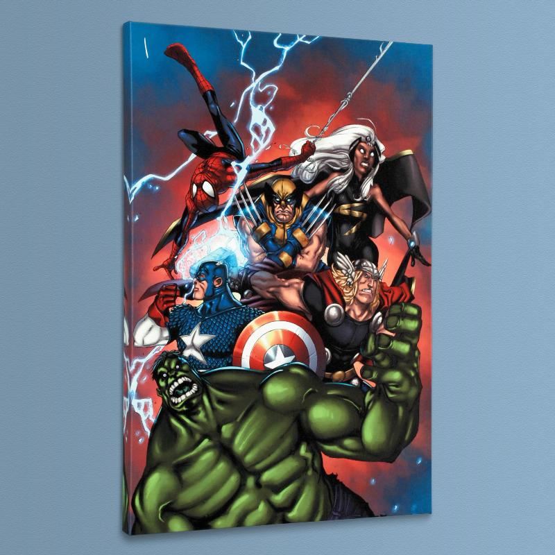 A piece of comic book history, this limited edition print, drawn by Ig Guara, depicts the classic Avengers. Brazilian artist Ig Guara was first known for his fantasy work. He was soon asked to be a penciller for Marvel's Marvel Adventures series. "Marvel Adventures: The Avengers #36" is a limited edition numbered giclee on canvas by Ig Guara presented by Marvel Comics. This piece comes gallery wrapped and ready to hang. Includes Certificate of Authenticity! Measure approx. 18" x 27" (image).