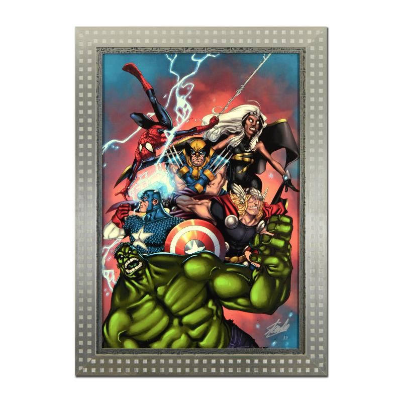 A piece of comic book history, this limited edition print, drawn by Ig Guara, depicts the classic Avengers. Brazilian artist Ig Guara was first known for his fantasy work. He was soon asked to be a penciller for Marvel's Marvel Adventures series. "Marvel Adventures: The Avengers #36" is a limited edition giclee on canvas from an AP edition by Ig Guara presented by Marvel Comics, hand signed by the great Stan Lee. This piece comes framed. Includes Letter of Authenticity. Measures approx. 27.5" x 38.5" (frame); 21.5" x 32.5" (image).