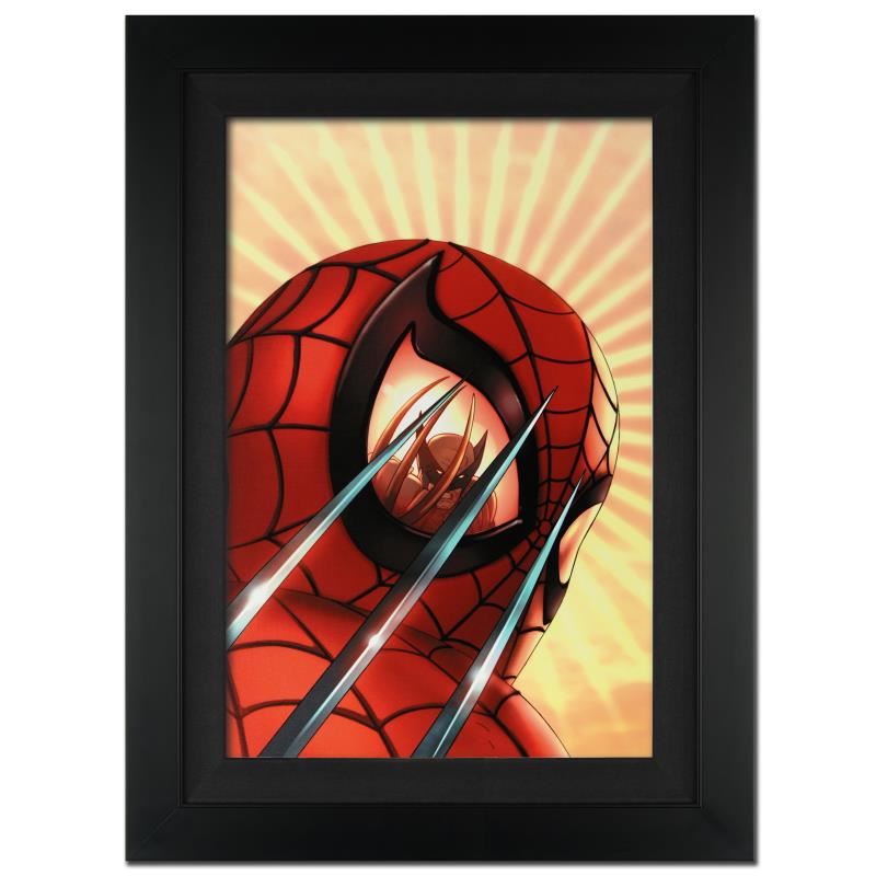 A piece of comic book history, this limited edition, from original art by Scott Kolins, depicts the heroic Spider-Man and Wolverine. Kolins' interest in drawing and comics began when he was around 10 years old as an avid comic book reader in the late 1970s. In 1991 he went to New Jersey and attended The Kubert School for two years before getting a job with Valiant Comics. He was then hired as a Romita Raider (in house art corrections under John Romita Sr.) at Marvel Comics. "Marvel Age Team Up #2" is an extremely limited edition giclee on canvas by Scott Kolins presented by Marvel Comics, hand signed by the Great Stan Lee (1922-2018) and numbered out of only 10! This piece is custom framed and ready to hang. Includes Certificate of Authenticity! Measures approx. 25" x 34" (with frame); 18" x 27" (image).