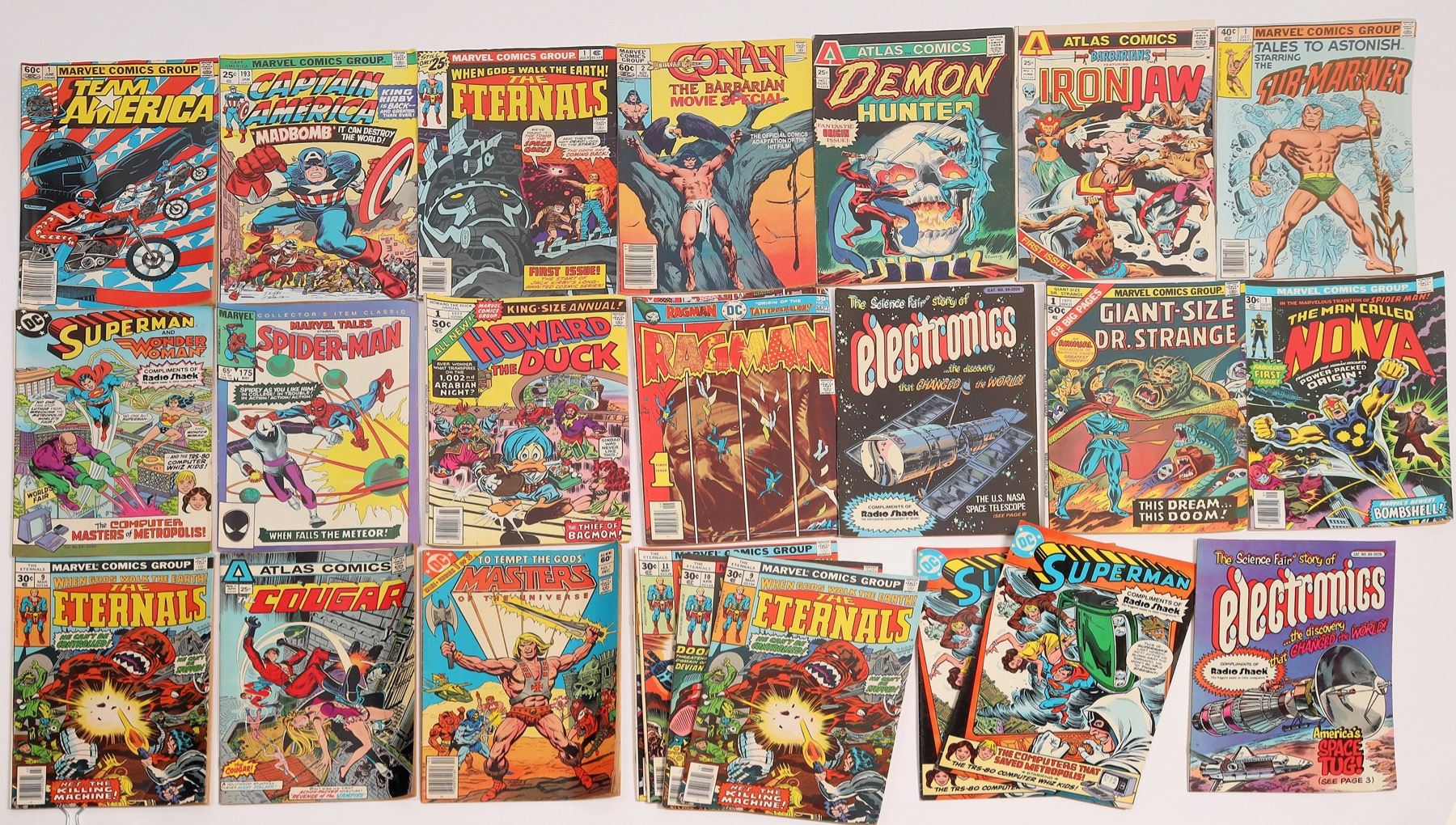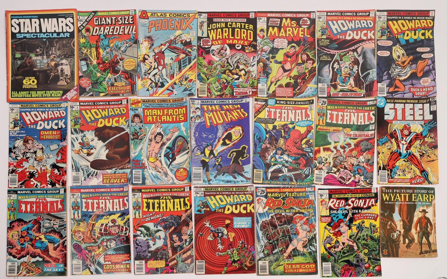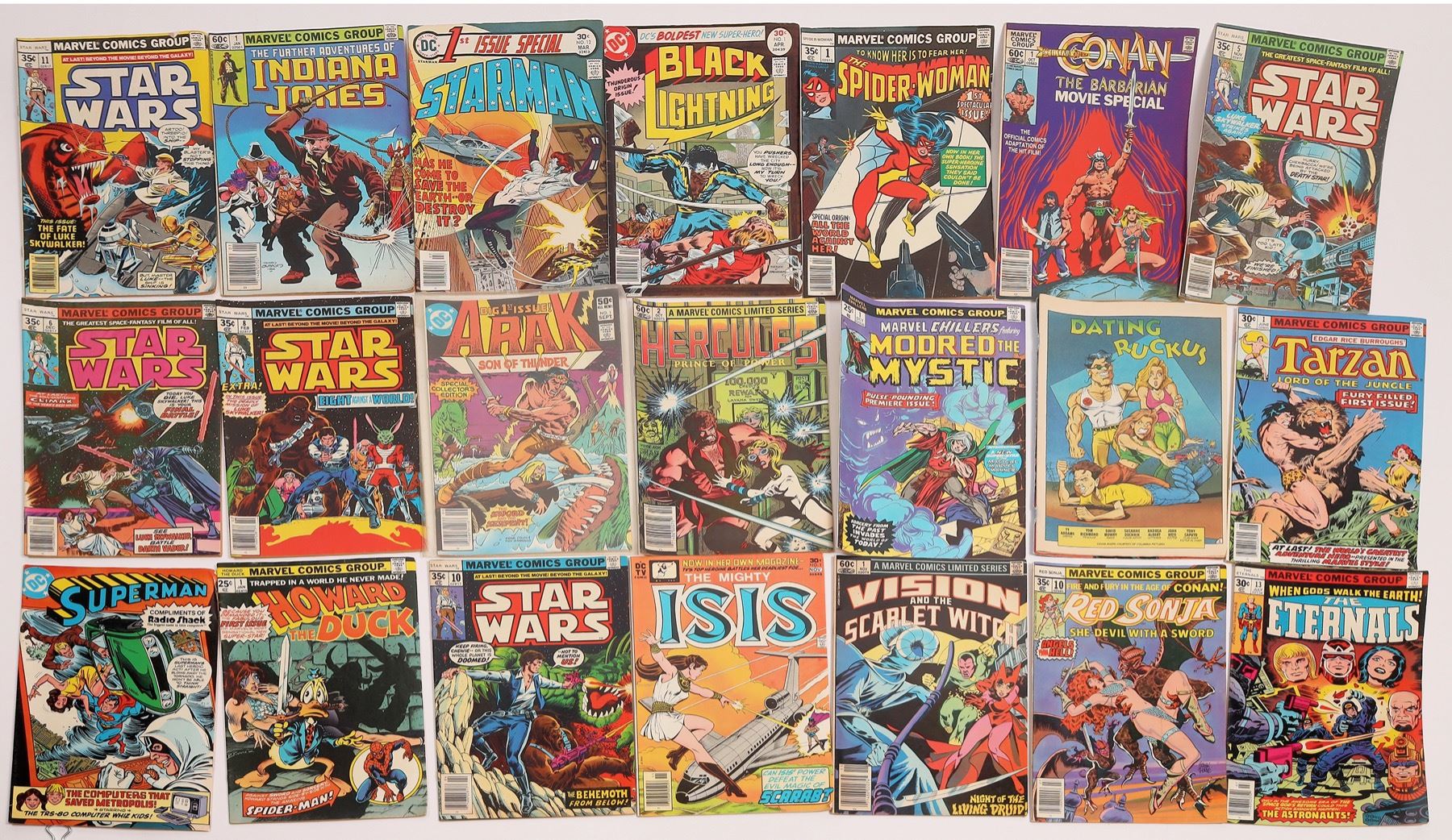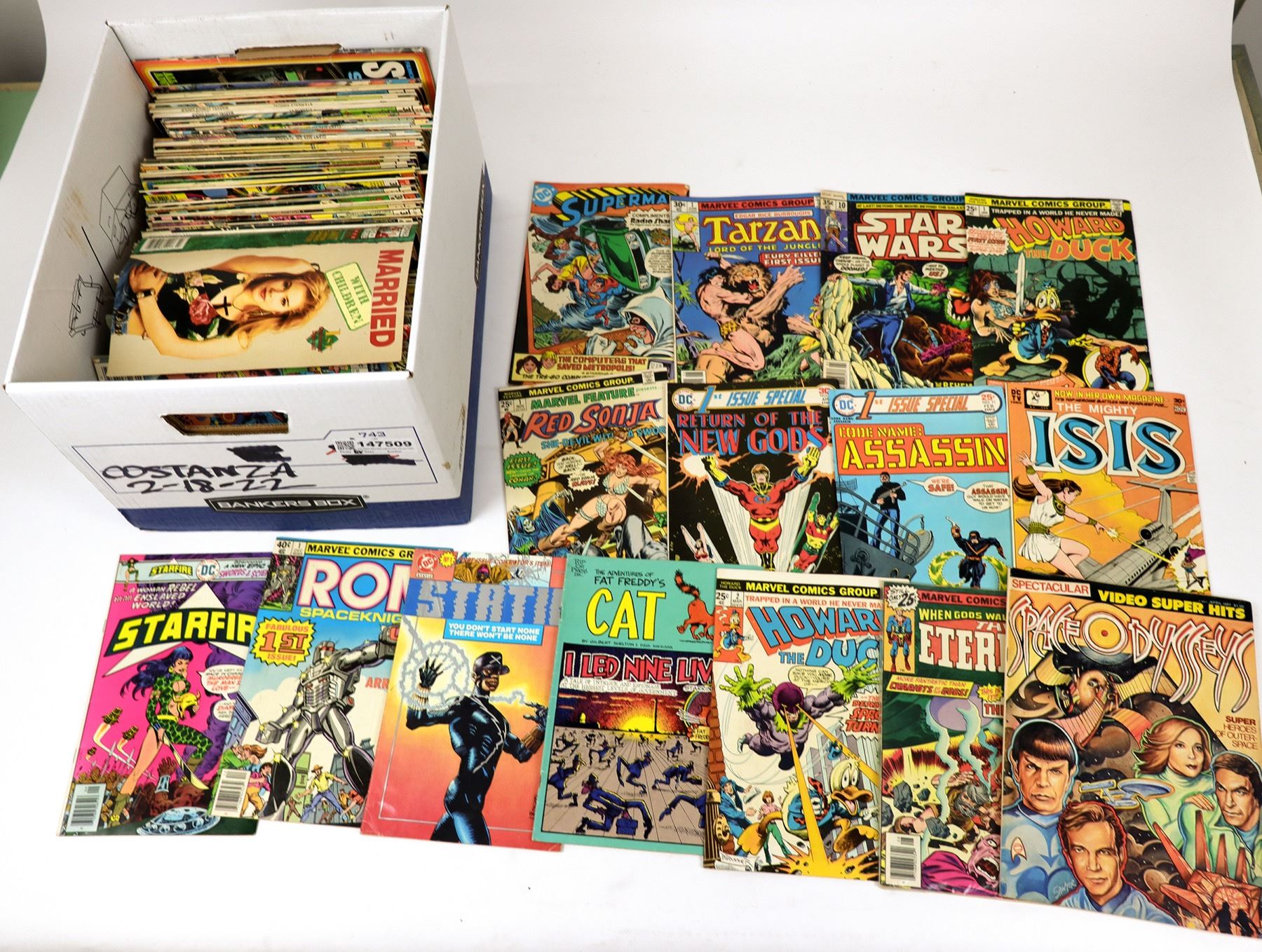 Bankers box of about 170 comic books from Marvel and Atlas. Star Wars, Howard the Duck, Captain America, Married With Children (with fold out poster of Christina Applegate) and many more. City: State: Date: