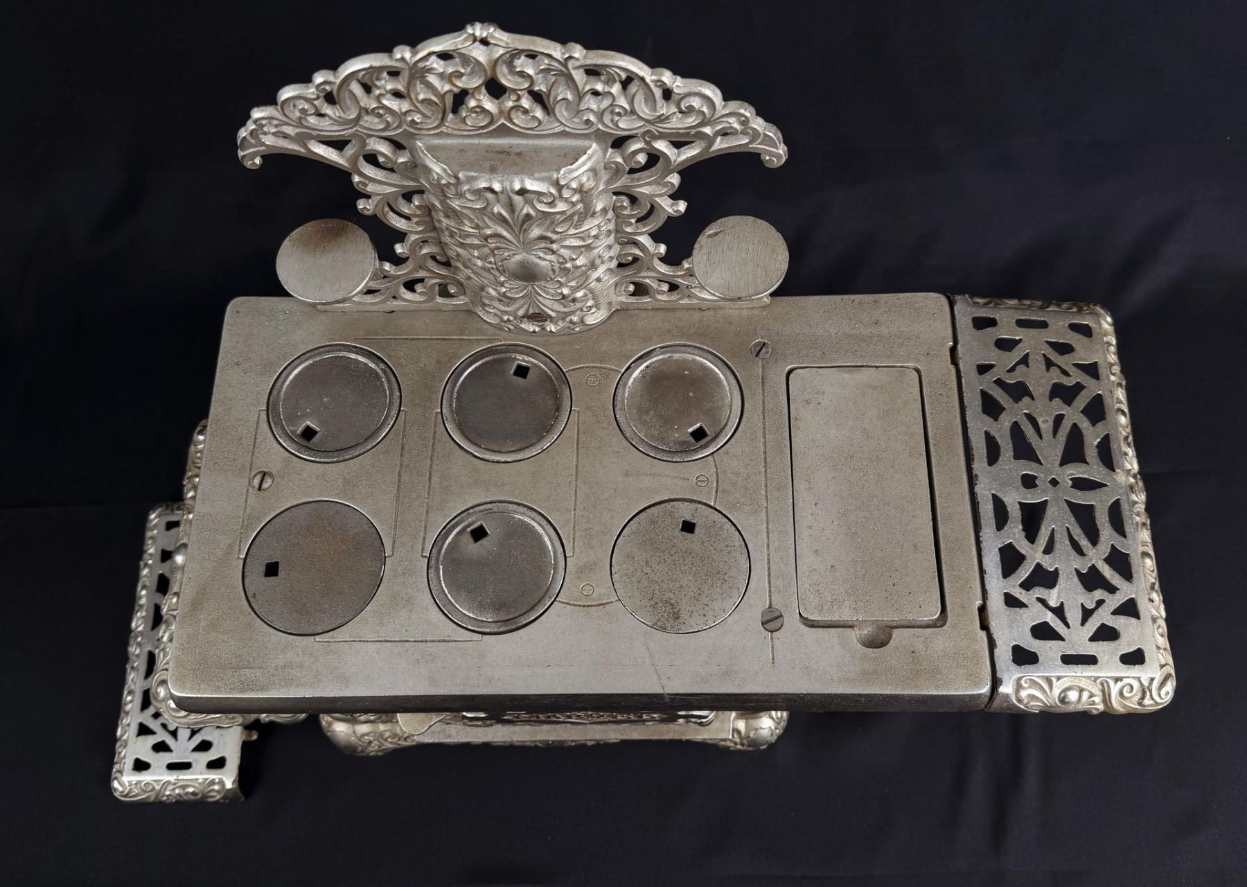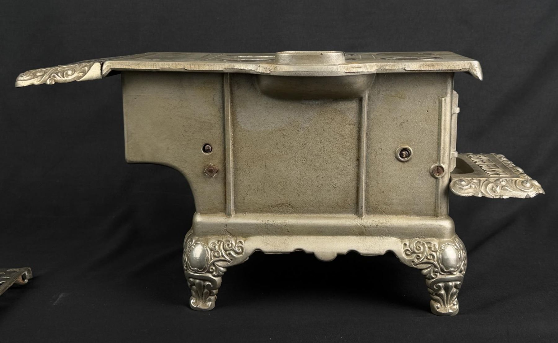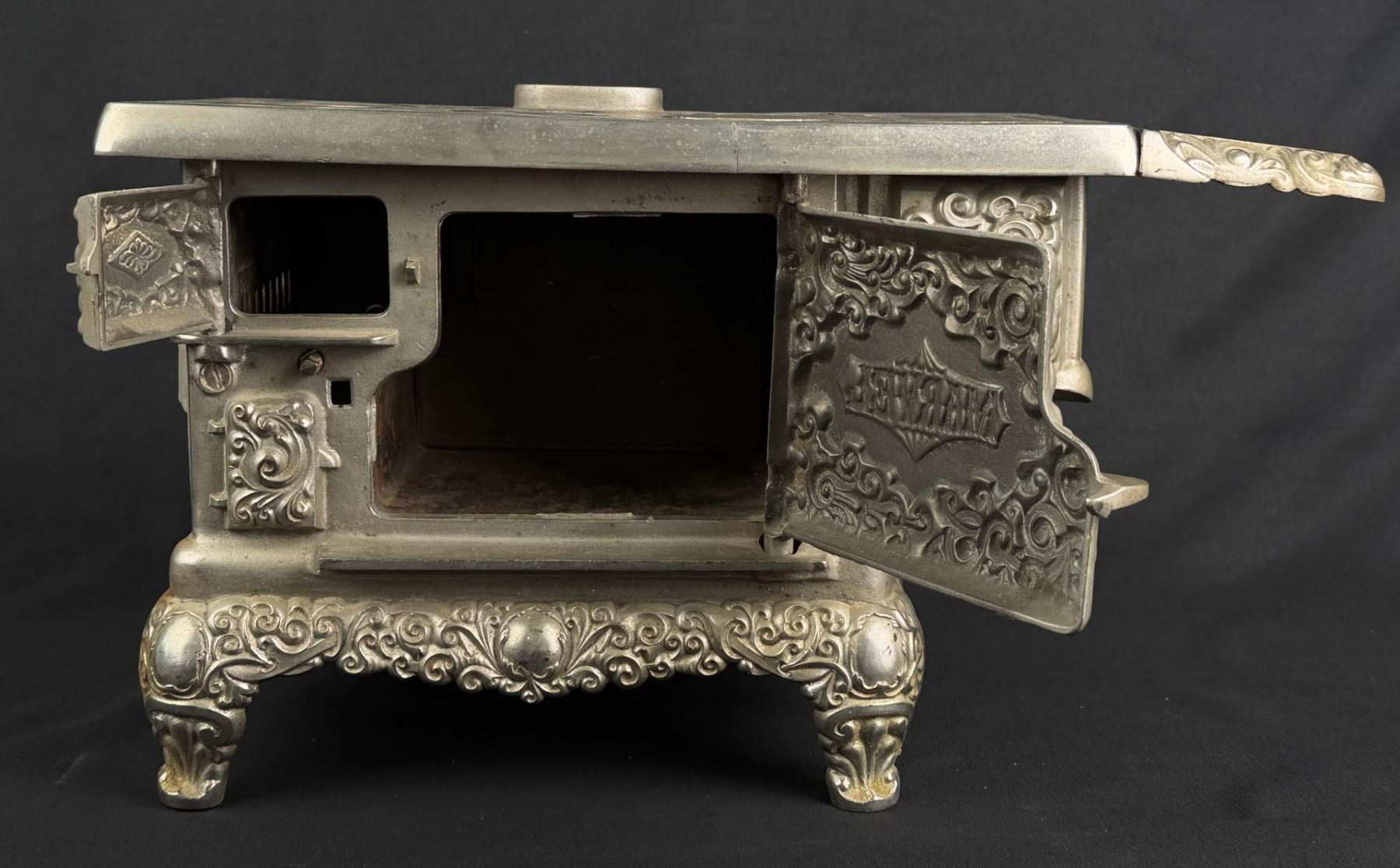 19 1/8" long by 9 1/2" wide by 8 3/8" tall. Bonnet keeper is split / cracked. Originally purchased from 1999 Darlene Wier Godot Auction, once belonged to the Rockefeller Family of New York.