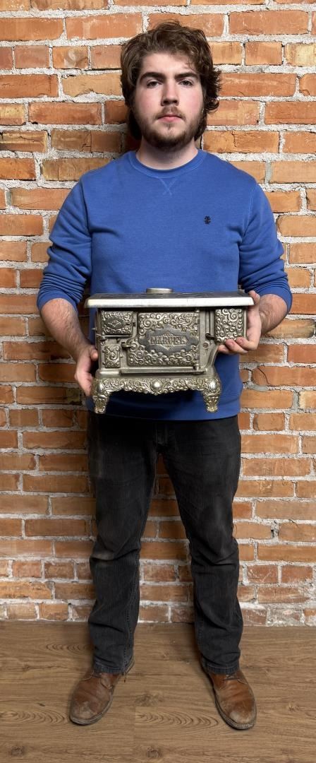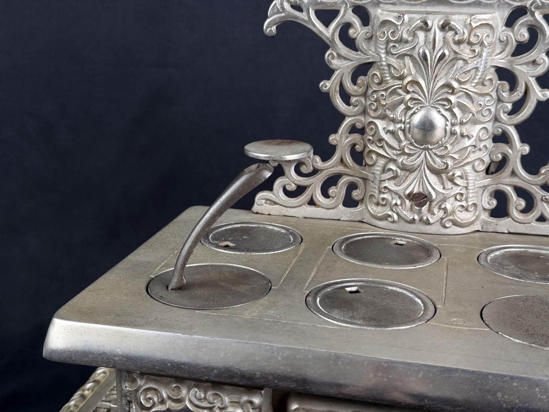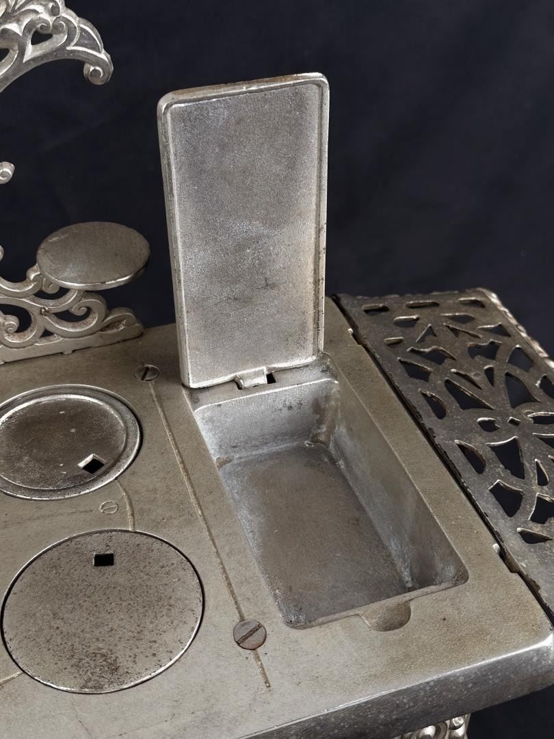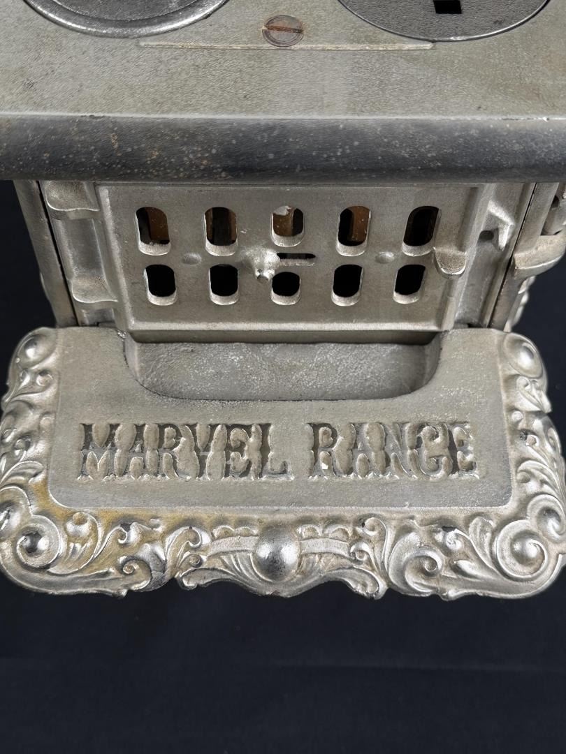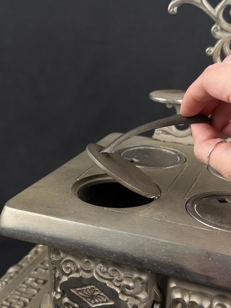19 1/8" long by 9 1/2" wide by 8 3/8" tall. Bonnet keeper is split / cracked. Originally purchased from 1999 Darlene Wier Godot Auction, once belonged to the Rockefeller Family of New York.