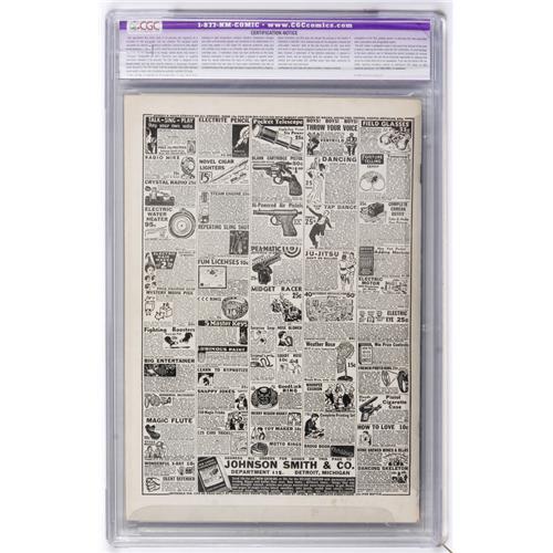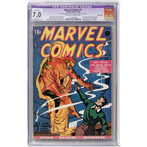 <B>Marvel Comics #1 Kansas City pedigree (Timely, 1939) CGC Apparent FN/VF 7.0 Slight (P) Off-white to white pages.</B></I> This issue is ranked as the third-most valuable comic of all for good reason, and, in fact, for years and years, it held the #1 spot in Overstreet's ranking. It's the first Timely comic, and it has the first newsstand appearances of both the Human Torch and the Angel. The famous cover is by Frank R. Paul. You'll often hear old-school collectors calling this <B>Marvel Mystery</B></I> #1, and with good reason, since the series, the company's flagship magazine, became <B>Marvel Mystery Comics</B></I> starting with issue #2. Also worth noting is that the blacked-out "Oct." at upper right with "Nov." printed on top is common to most copies of this issue. This copy hails from the Kansas City collection, which also had a very nice <B>Captain America Comics</B></I> #1. CGC notes, "Restoration includes: tear seals to cover, cover cleaned and reinforced." Overstreet 2006 GD 2.0 value = $21,000; VG 4.0 value = $42,000; FN 6.0 value = $63,000.<BR><BR><b>Shipping:</b> Comics - Slabbed (certified) (<a target="_blank" href="http://www.heritageauctions.com/common/shipping.php">view shipping information</a>)