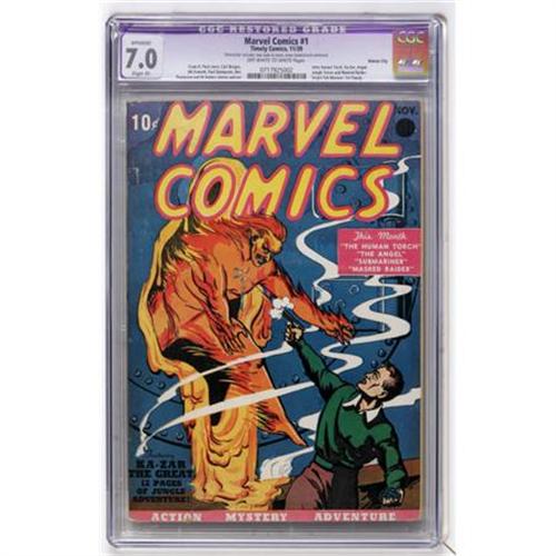 <B>Marvel Comics #1 Kansas City pedigree (Timely, 1939) CGC Apparent FN/VF 7.0 Slight (P) Off-white to white pages.</B></I> This issue is ranked as the third-most valuable comic of all for good reason, and, in fact, for years and years, it held the #1 spot in Overstreet's ranking. It's the first Timely comic, and it has the first newsstand appearances of both the Human Torch and the Angel. The famous cover is by Frank R. Paul. You'll often hear old-school collectors calling this <B>Marvel Mystery</B></I> #1, and with good reason, since the series, the company's flagship magazine, became <B>Marvel Mystery Comics</B></I> starting with issue #2. Also worth noting is that the blacked-out "Oct." at upper right with "Nov." printed on top is common to most copies of this issue. This copy hails from the Kansas City collection, which also had a very nice <B>Captain America Comics</B></I> #1. CGC notes, "Restoration includes: tear seals to cover, cover cleaned and reinforced." Overstreet 2007 GD 2.0 value = $21,250; VG 4.0 value = $42,500; FN 6.0 value = $63,750.<BR><BR><b>Shipping:</b> Comics - Slabbed (certified) (<a target="_blank" href="http://www.heritageauctions.com/common/shipping.php">view shipping information</a>)