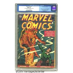 Marvel Comics #1 (Timely, 1939) CGC FR/GD 1.5 Off-white to white pages. If you're like most of us, you haven't quite saved up enough moolah for a high-grade copy of this issue, or even a mid-grade copy. But, hey! This is the historical comic book that begat all Timelys, Atlases, and Marvels to come, ranked third in value among all comics ever, so a complete copy, even in our offered grade, is one big deal. Same blockbusting first appearances of the Human Torch, Sub-Mariner, Angel, and Ka-Zar by Carl Burgos, Bill Everett, and Paul Gustavson, in convenient lower priced form! CGC notes, "5 pieces of tape on cover, interior cover, and 1st wrap." Overstreet 2003 GD 2.0 value = $18,750. Important notice: Heritage usually auctions material at the rate of 200-250 lots per hour. On some occasions eBay Live bid software or the Internet may not be able to keep up with the pace of the auction. We recommend placing a realistic absentee bid now as insurance to avoid disappointment. Occasionally the auctioneer may eliminate or reject an eBay Live bid, and the auctioneer may also reopen a lot after the close of the eBay live bidding (usually because we missed an audience bid), and may reject your bid even if it shows you as the winning bidder. By bidding via eBay Live, you agree that Heritage may award the lot to another bidder at its sole discretion under the circumstances described above or any other reasonable circumstances. Since eBay bids are not shown to us until we open the lot on the floor, we treat those bids just like floor bids. In most cases the floor responds before the eBay bid is presented to us, due to Internet lag time, so for consistency we have made it a policy that floor bids are always considered first over tie eBay live bids. Also please note that all Heritage lots purchased through eBay Live carry a 20% Buyer's Premium. Please make sure you read the Terms and Conditions before you bid.