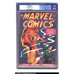 Marvel Comics #1 (Timely, 1939) CGC VG/FN 5.0 Cream to off-white pages. Marvel #1's first print run was a sellout, prompting a second printing that involved blacking out the October date and placing "NOV" above it. This copy is from the rarer first printing, and has excellent printing registration, something also rarely found on Marvel #1. The front cover has a sharp look to it, with a penciled name in the logo. The back cover exhibits most of the damage, including a 1.5" tear at the top, a couple of corner creases and light soiling. A slight spine roll exists, but the spine itself is in great condition. Overstreet 2002 GD 2.0 value = $16,667; FN 6.0 value = $50,000. Important notice: We expect to be auctioning lots at the rate of 200-250 per hour. Sometimes eBay Premier live bid software cannot keep up with that pace, so we strongly recommend that you place a realistic proxy bid now as insurance to avoid disappointment. Also please note that all Heritage/CAA lots purchased through eBay Premier carry a 20% Buyer's Premium. Please make sure you read the Terms and Conditions.