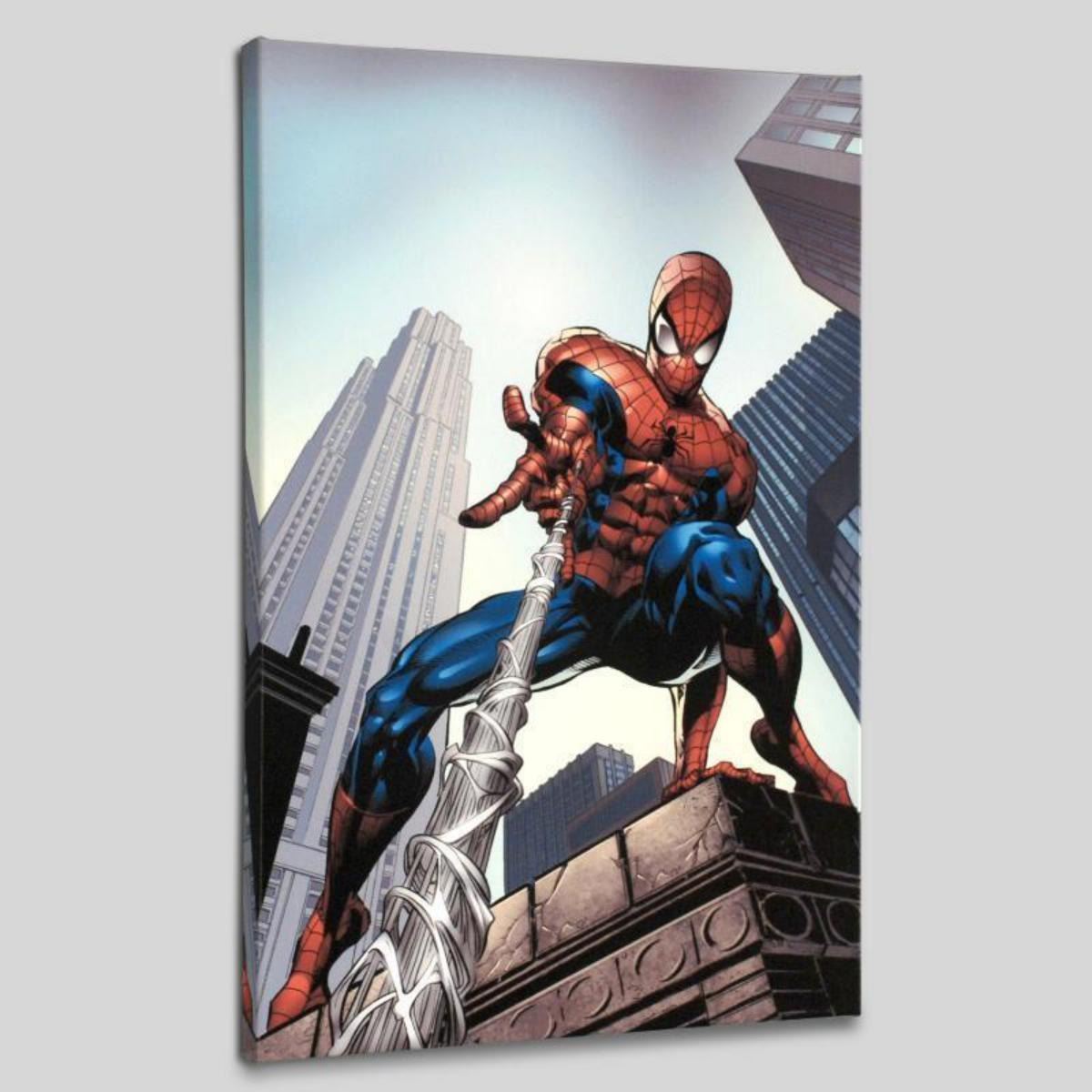 A piece of comic book history, this limited edition, from original art by Mike Deodato Jr., depicts a heroic Spider-Man. Brazilian artist Mike Deodato Jr. has become an enduring fan favorite, working in styles ranging from wildly energetic cartooning to moody photorealism. Deodato became one of the decade's most prolific and in-demand artists, including Marvel credits such as Avengers, Elektra, Incredible Hulk, Spider-Man and Thor. "Amazing Spider-Man #520" is a limited edition numbered giclee on stretched canvas by Mike Deodato Jr. presented by Marvel Comics. This piece comes gallery wrapped. Includes Certificate of Authenticity! Measure approx. 18" x 27" (image); 1.5" (depth). Reference #: 236942.