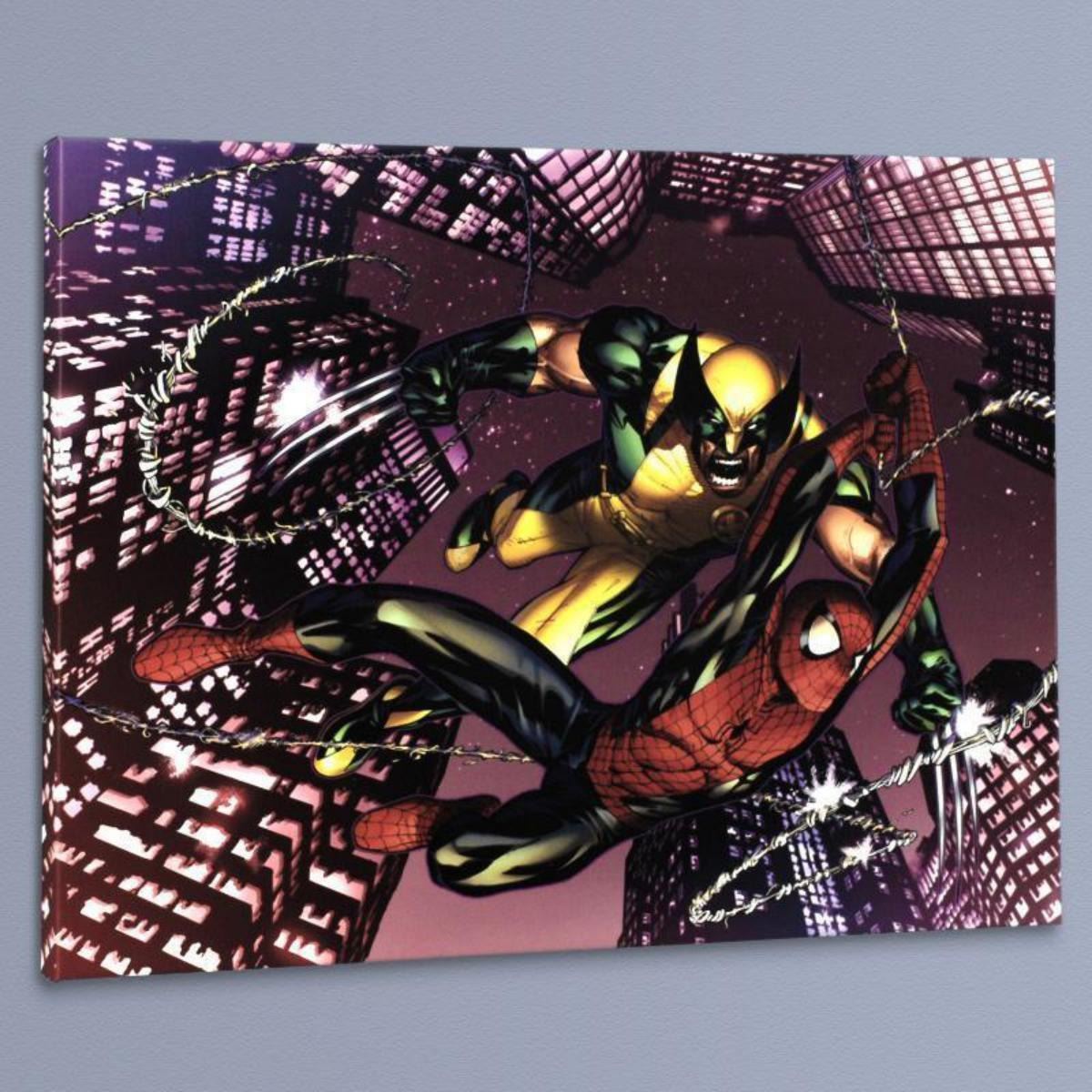 A piece of comic book history, this limited edition, from original art by Adam Kubert, depicts the heroic Spider-Man and Wolverine. Adam Kubert began his professional comics career at age 12 as a letterer. He went on to attend the Rochester Institute of Technology, graduating with a degree in medical illustration. He subsequently attended The Kubert School in Dover, New Jersey. He is known for his work on such titles as: Ultimate X-Men, Ultimate Fantastic Four, Incredible Hulk, Wolverine. "Astonishing Spider-Man & Wolverine #1" is a limited edition numbered giclee on canvas by Adam Kubert presented by Marvel Comics. This piece comes gallery wrapped. Includes Certificate of Authenticity! Measures approx. 24" x 18" (image). Reference #: 236934.