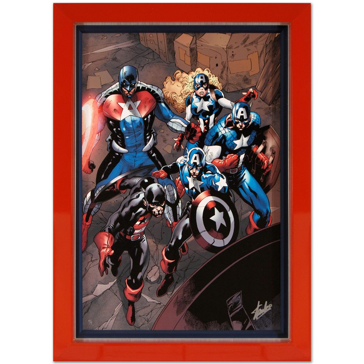 A piece of comic book history, this limited edition print, drawn by Phil Briones, depicts America Corps characters: Captain America, U.S. Agent, American Dream and Commander A. Born in Dijon, France, Briones started his career as an animator for Walt Disney Feature Animation. He has also been the artist on several French comic series. Briones received his degree from the Gobelins School. Briones has worked on such Marvel titles as Captain America, Iron Man, X-Men and more recently, White Tiger. "Captain America Corps #2" is a limited edition giclee on canvas by Phil Briones presented by Marvel Comics, hand signed by the great Stan Lee and numbered out of only 4! This piece has been custom framed and ready to hang. Measure approx. 28" x 38.5" (framed); 21.5" x 32" (image).