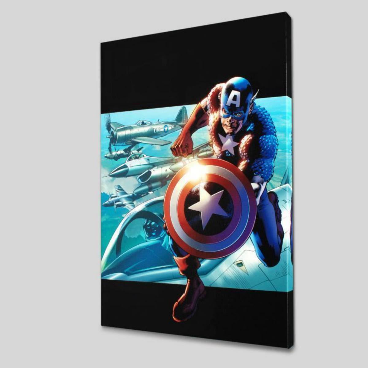 A piece of comic book history, this limited edition, from original art by Bryan Hitch, depicts the heroic Captain America. British artist Bryan Hitch was inspired by comic books at an early age. Not only has Hitch worked on the The Avengers, Captain America, and She-Hulk, but he also did the character design for the Ultimate Avengers and Ultimate Avengers 2 animated films. "Captain America: Man Out Of Time #2" is a limited edition numbered giclee on stretched canvas by Bryan Hitch presented by Marvel Comics. This piece comes gallery wrapped. Includes Certificate of Authenticity! Measure approx. 18" x 27" (image); 1.5" (depth). Reference #: 236789.
