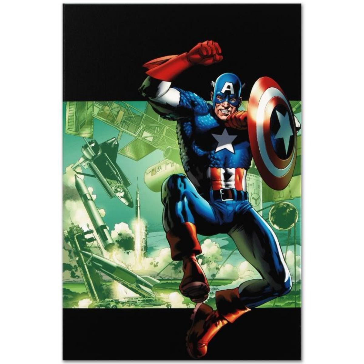 A piece of comic book history, this limited edition, from original art by Bryan Hitch, depicts the heroic Captain America. British artist Bryan Hitch was inspired by comic books at an early age. Not only has Hitch worked on the The Avengers, Captain America, and She-Hulk, but he also did the character design for the Ultimate Avengers and Ultimate Avengers 2 animated films. "Captain America: Man Out Of Time #4" is a limited edition giclee on canvas by Bryan Hitch presented by Marvel Comics! This piece comes gallery wrapped. Includes Certificate of Authenticity! Measures approx. 18" x 27" (image); 1.5" (depth).