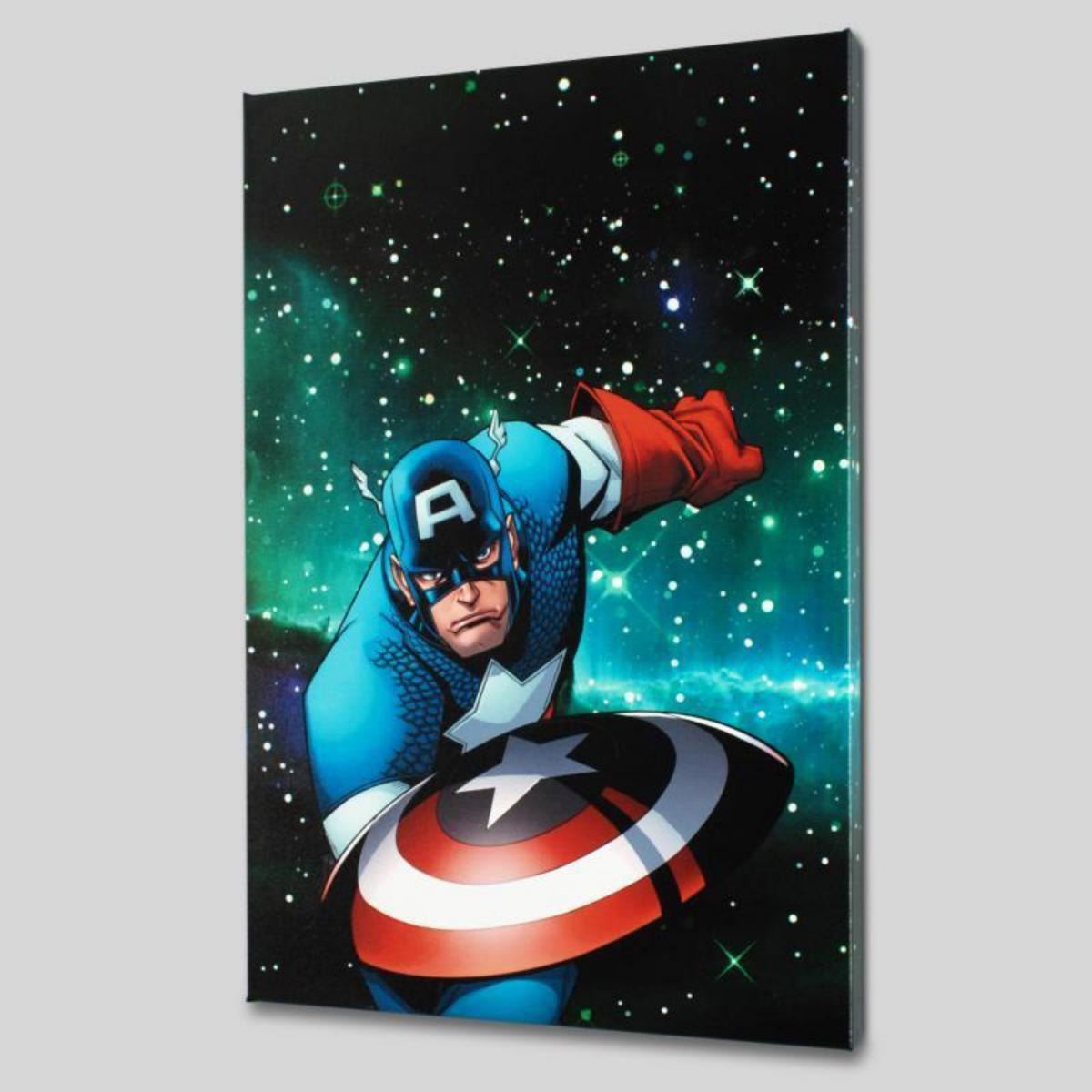 A piece of comic book history, this limited edition, from original art by Craig Rousseau, depicts the heroic Captain America. Known for his work for both Marvel and DC Comics, Craig Rousseau has drawn for both the Captain America and Spider-Man franchises. "Captain America and the Korvac Saga #1" is a limited edition numbered giclee on stretched canvas by Craig Rousseau presented by Marvel Comics. This piece comes gallery wrapped. Includes Certificate of Authenticity! Measure approx. 18" x 27" (image); 1.5" (depth). Reference #: 236788.