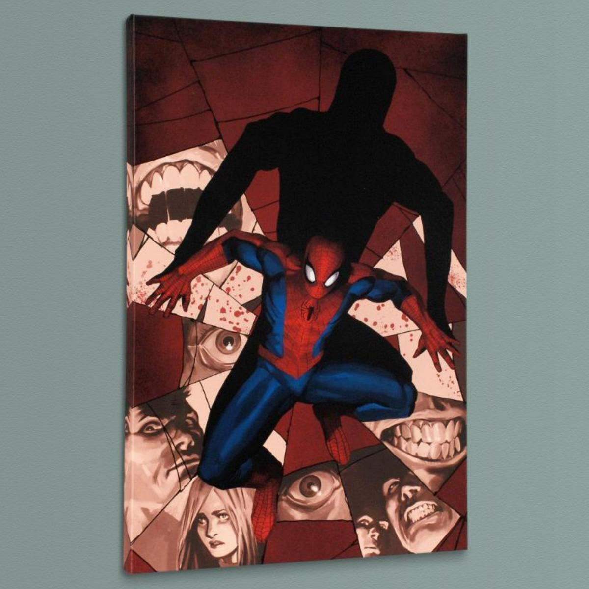 A piece of comic book history, this limited edition, from original art by Marko Djurdjevic, depicts Spider-Man. Marko Djurdjevic was discovered by Marvel after posting a series of re-designs for popular X-Men characters. Marvel then offered Djurdjevic the opportunity to draw covers for some of their popular series, like Spider-Man, Daredevil, and Thor. "Fear Itself: Spider-Man #1" is a limited edition giclee on canvas by Marko Djurdjevic presented by Marvel Comics. This piece comes gallery wrapped. Includes Certificate of Authenticity! Measure approx. 18" x 27" (image); 1.5" (depth). Reference #: 236933.
