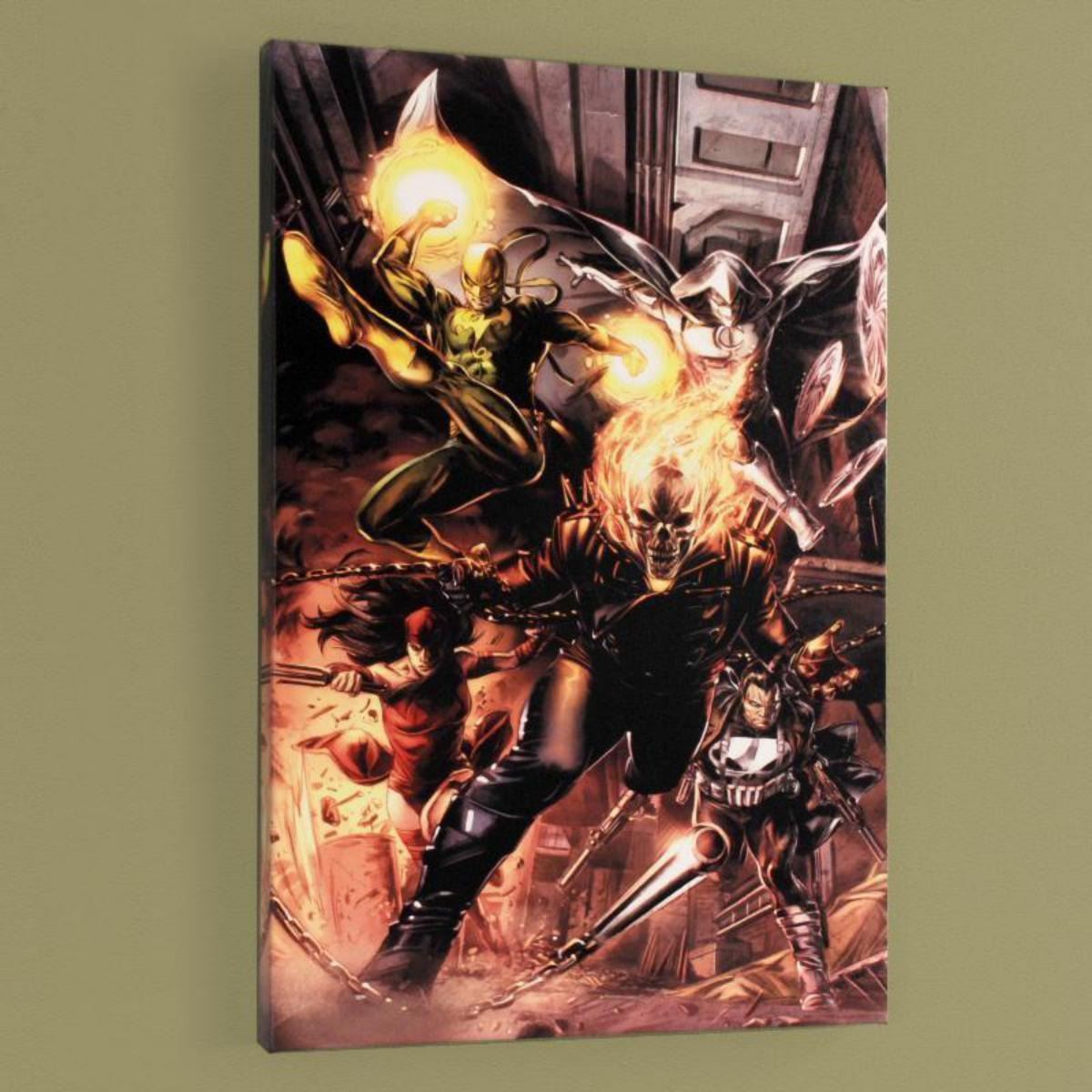 A piece of comic book history, this limited edition, from original art by Doug Braithwaite, depicts action-packed power figures. Doug Braithwaite started out working on British comics, like 2000 AD and A1, but is best known for his Marvel Comics work on the Earth X sequels, Universe X and Paradise X, as well as The Punisher Kills, the Marvel Universe, and Punisher: MAX. "Heroes For Hire #1" is a limited edition giclee on canvas by Doug Braithwaite presented by Marvel Comics. This piece comes gallery wrapped. Includes Certificate of Authenticity! Measures approx. 18" x 27" (image); 1.5" (depth). Reference #: 236905.