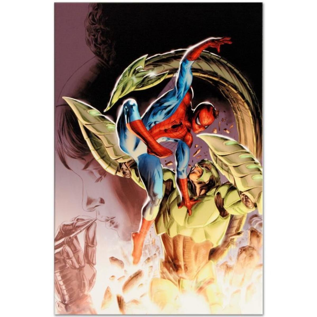 A piece of comic book history, this limited edition, from original art by Doug Braithwaite, depicts Spider-Man and Scorpion. Doug Braithwaite started out working on British comics, like 2000 AD and A1, but is best known for his Marvel Comics work on the Earth X sequels, Universe X and Paradise X, as well as The Punisher Kills, the Marvel Universe, and Punisher: MAX. "Heroes For Hire #8" is a limited edition giclee on canvas by Doug Braithwaite presented by Marvel Comics. This piece comes gallery wrapped. Includes Certificate of Authenticity! Measures approx. 18" x 27" (image); 1.5" (depth).