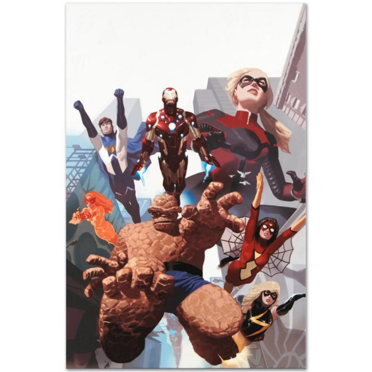 A piece of comic book history, this limited edition, from original art by Daniel Acuna, depicts Thing, Spider Woman, , Ms. Marvel, Iron Man, Stature, Justice, and Firestar. Spanish artist Daniel Acuna cites artists like Jack Kirby and Simon Bisley as his early artist influences. After doing some occasional cover art for Marvel, Acuna signed an exclusive contract with Marvel in 2007. "I Am An Avenger #4" is a limited edition numbered giclee on stretched canvas by Daniel Acuna presented by Marvel Comics. This piece comes gallery wrapped. Includes Certificate of Authenticity! Measure approx. 18" x 27" (image); 1.5" (depth). This item requires special handling and may have a longer than usual turnaround. Reference #: 236747