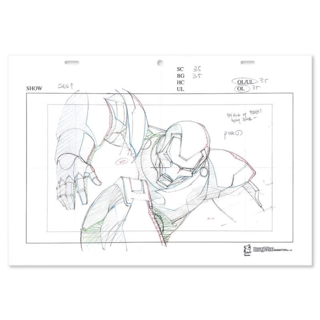 "Iron Man" is an original production drawing on animation paper by Marvel Comics. Includes Letter of Authenticity. Measures approx. 14" x 10" (image).