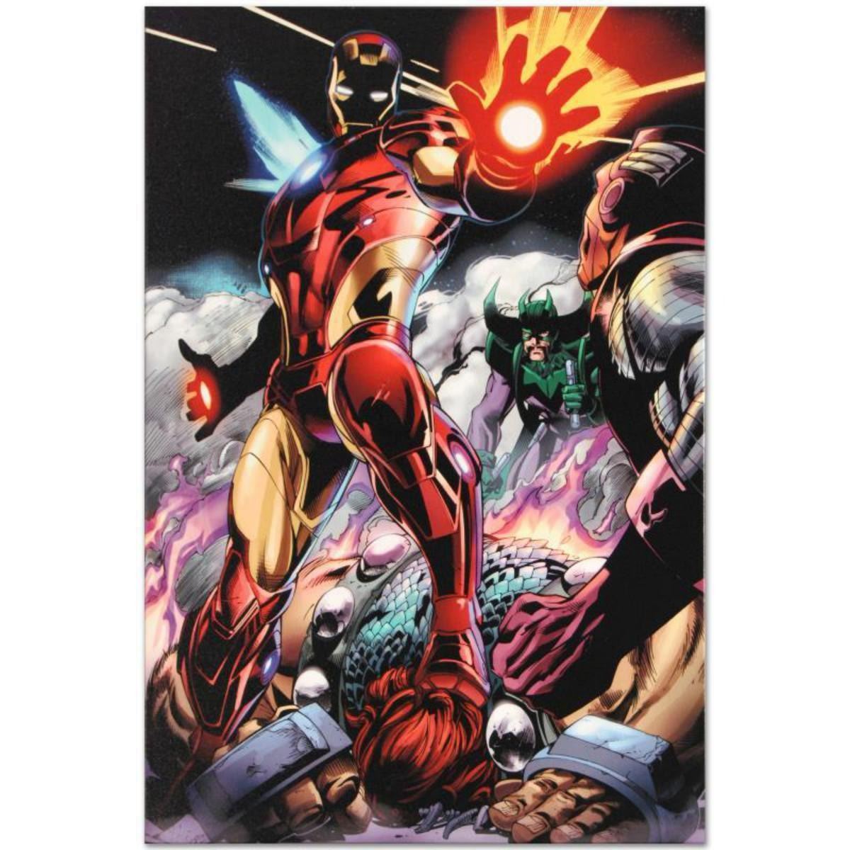 A piece of comic book history, this limited edition, from original art by Scot Eaton, depicts an action packed scene starring Iron Man. Born and raised in Vermont, Scot Eaton's artistic talent became apparent in elementary school when he created detailed drawings of dinosaurs and comic characters like Spider-Man. After high school graduation, he went on to college. In the early 1990s he started penciling for DC comics from his apartment. He went on to draw Silver Surfer and Thor for Marvel. "Iron Man/Thor #2" is a limited edition giclee on canvas by Scot Eaton presented by Marvel Comics! This piece comes gallery wrapped. Includes Certificate of Authenticity! Measures approx. 18" x 27" (image). This item requires special handling and may have a longer than usual turnaround. Reference #: 236904.
