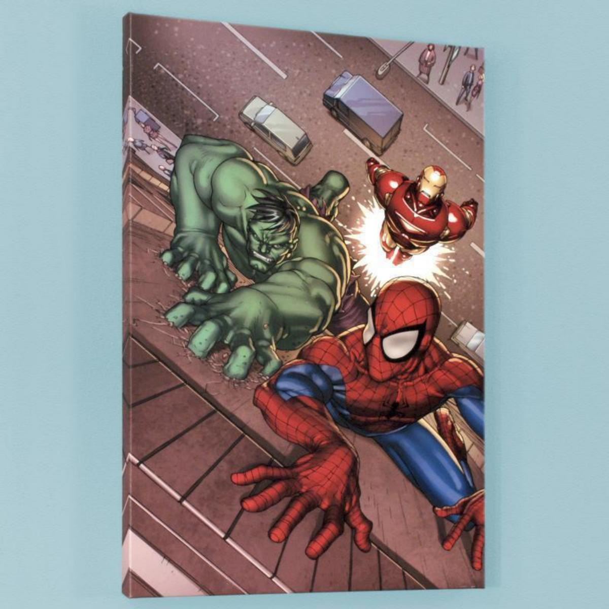 A piece of comic book history, this limited edition, from original art by Roger Cruz, depicts Spider-Man, Hulk, and Iron Man. Cruz started his professional career as a letterer for a Brazilian publishing house; then worked as a writer and art assistant for a short-lived black and white comics magazine. When Art & Comics Studio first introduced Brazilian artists to the American comic book market, he was given the opportunity to work as an artist for Marvel Comics on the titles Ghost Rider, Hulk, X-Men Avengers: Timeslide and Silver Surfer. "Marvel Adventures: Super Heroes #3" is a limited edition giclee on canvas by Roger Cruz presented by Marvel Comics. This piece comes gallery wrapped. Includes Certificate of Authenticity! Measures approx. 18" x 27" (image); 1.5" (depth). Reference #: 236882.