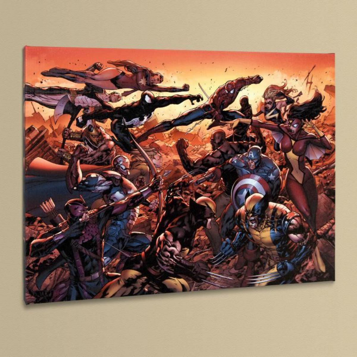 A piece of comic book history, this limited edition, from original art by Billy Tan, depicts Wolverine, Spider-Man, Spider Woman, Captain America, Hawkeye, Iron Patriot, Ares, and Ms. Marvel. Billy Tan grew up in Malaysia and moved to the United States in 1989 to study business at the University of Kentucky. He began working as a penciler for Image Comics in the 1990s. Tan became the regular artist of the Marvel Comics series Uncanny X-Men in 2006. In 2008, he was invited to draw New Avengers Secret Invasion tie-in issues #41 and 43-44. "New Avengers #50" is a limited edition numbered giclee on stretched canvas by Billy Tan presented by Marvel Comics. This piece comes gallery wrapped. Includes Certificate of Authenticity! Measures approx. 24" x 18" (image); 1.5" (depth). Reference #: 236668.