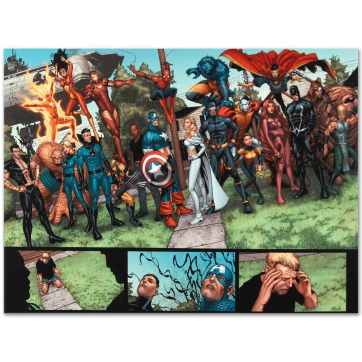 A piece of comic book history, this limited edition, from original art by Steve McNiven, depicts characters from the New Avengers, X-Men, Fantastic Four, and Inhumans. Known for being the penciller of the Marvel mini-series "Civil War," Steve McNiven has also contributed art to Spider-Man and Wolverine, among others. "New Avengers #8" is a limited edition numbered giclee on canvas by Steve McNiven presented by Marvel Comics. This piece comes gallery wrapped. Includes Certificate of Authenticity! Measure approx. 24" x 18" (image).