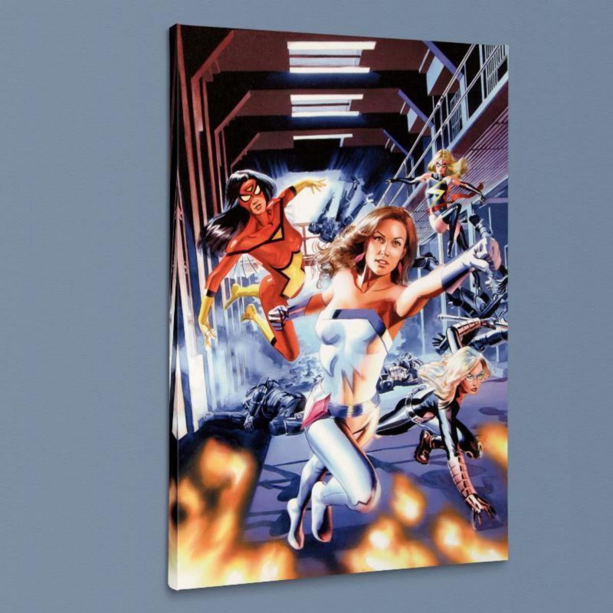A piece of comic book history, this limited edition, from original art by Mike Mayhew, depicts the classic characters Jewel, Mockingbird, Spider Woman, and Ms. Marvel. Mike Mayhew has been a working in comics since 1992. He revolutionized interior comic art with full pencil rendering. Mike took his cover skills to Marvel where he dazzled viewers with his depictions of Mystique, Elektra and She-Hulk. "New Avengers Annual #3" is a limited edition numbered giclee on stretched canvas by Mike Mayhew presented by Marvel Comics. This piece comes gallery wrapped. Includes Certificate of Authenticity! Measure approx. 18" x 27" (image); 1.5" (depth). Reference #: 236751.