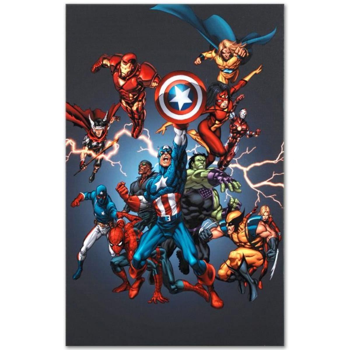 A piece of comic book history, this limited edition, from original art by Tom Grummett, depicts an action packed scene featuring the Avengers. While working for Marvel, Tom Grummett was the penciller on the Thunderbolts series and also co-created the X-Men Forever series. "Official Handbook: Avengers 2005" is a limited edition giclee on canvas by Tom Grummett presented by Marvel Comics! This piece comes gallery wrapped. Includes Certificate of Authenticity! Measures approx. 18" x 27" (image); 1.5" (depth).