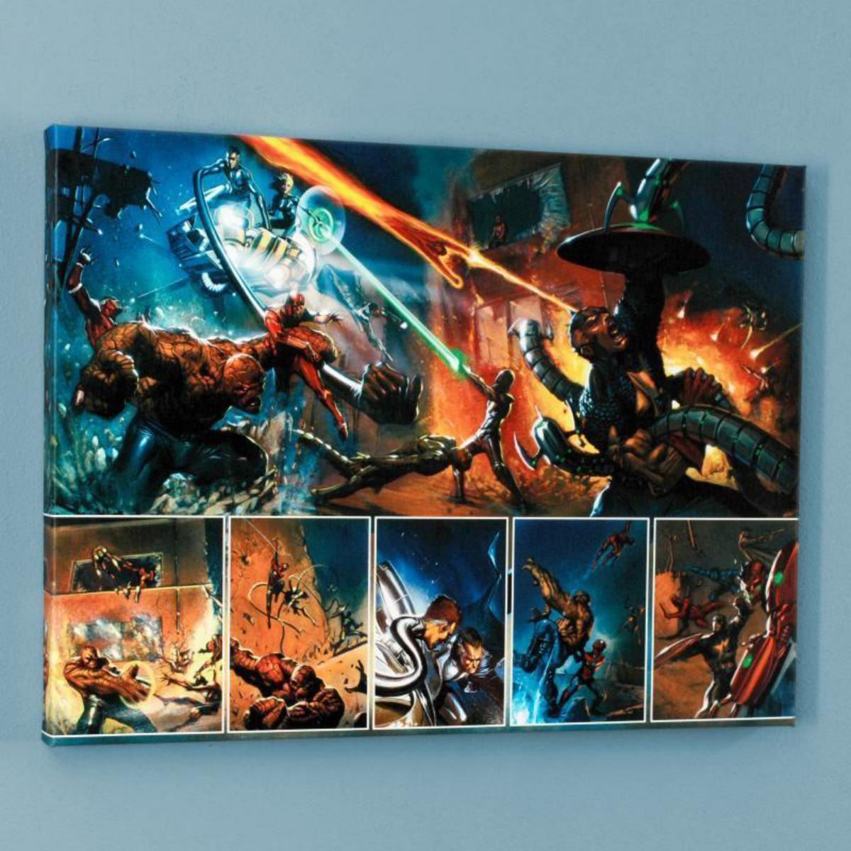 A piece of comic book history, this limited edition, from original art by Gabriele Dell'Otto, depicts an intense scene from the Fantastic Four. In 1998 Dell'Otto started collaborating with the European division of Marvel Comics, producing covers, posters and lithographies for Italy, France and Germany. In 2002, his work was shown to the editor-in-chief of Marvel Comics, who entrusted to him with the art for the Secret War mini-series. "Secret War #4" is a limited edition giclee on canvas by Gabriele Dell'Otto presented by Marvel Comics! This piece comes gallery wrapped. Includes Certificate of Authenticity! Measures approx. 24" x 18" (image). Reference #: 236797.