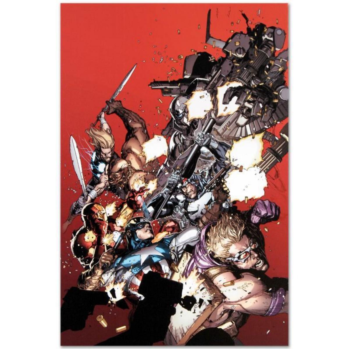 A piece of comic book history, this limited edition, from original art by Leinil Francis Yu, depicts the heroic Avengers. After winning the Wizard's Drawing Board Contest, Marvel Comics hired Leinil Francis Yu to work on the Wolverine series. After his run on Wolverine, he moved on to work on Marvel's core X-Men title in 2000. Yu continued to work on other Marvel titles such as Fantastic Four, Ultimate Wolverine vs. Hulk and New Avengers. "Ultimate Avengers vs. New Ultimates #1" is a limited edition numbered giclee on stretched canvas by Leinil Francis Yu presented by Marvel Comics. This piece comes gallery wrapped. Includes Certificate of Authenticity! Measures approx. 18" x 27" (image); 1.5" (depth). Reference #: 236664.