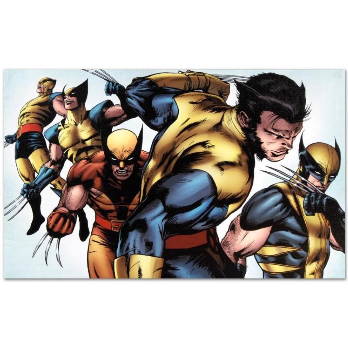A piece of comic book history, this limited edition, from original art by Patrick Zircher, depicts the heroic Wolverine. Zircher's early career as an illustrator in the genre began with production of several completed works for Villains and Vigilantes, Champions and other pen and paper role-playing games as well as early stints with independent comic book publishers. Following this he went on to work largely for Marvel Comics on leading titles like Iron Man, Thunderbolts and New Warriors but also did a considerable amount of work for DC. He is currently exclusive with Marvel Comics. "X-Men Evolutions #1" is a limited edition numbered giclee on stretched canvas by Patrick Zircher presented by Marvel Comics. This piece comes gallery wrapped. Includes Certificate of Authenticity! Measures approx. 27" x 18" (image); 1.5" (depth).