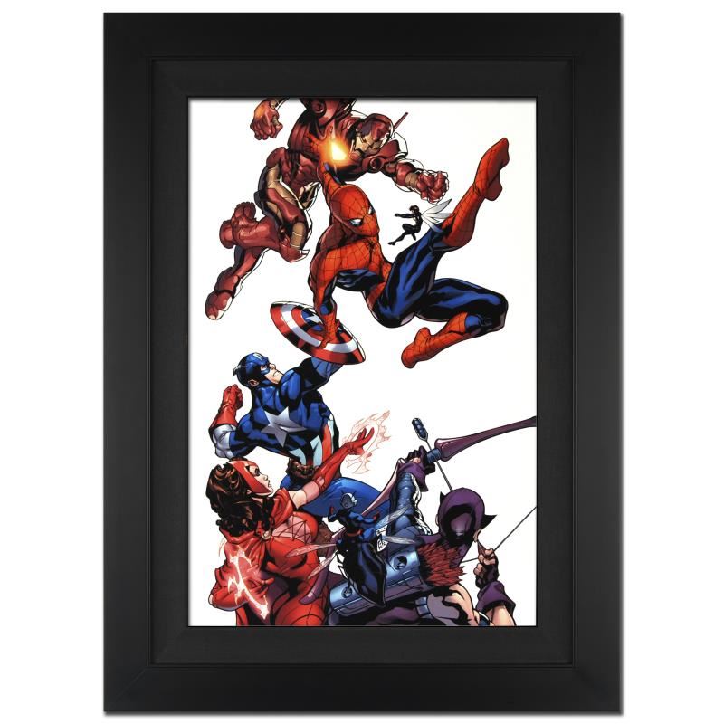 A piece of comic book history, this limited edition, from original art by Terry Dodson, depicts the classic characters Captain America, Spider-Man, and Iron Man. Known primarily for his work on the X-Men franchise, Terry Dodson has also contributed to the Spider-Man franchise, particularly in the "Marvel Knights Spider-Man" mini series. "Marvel Knights Spider-Man #2" is an extremely limited edition giclee on canvas by Terry Dodson presented by Marvel Comics, hand signed by the great Stan Lee and numbered out of only 4! This piece comes custom framed and ready to hang. Includes Certificate of Authenticity! Measures approx. 29" x 40" (with frame), 22" x 33" (image).