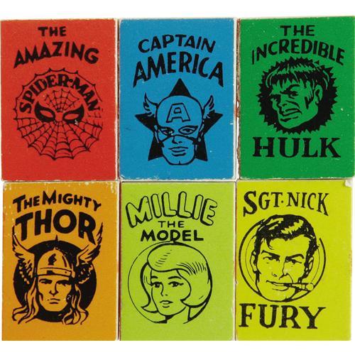 Overstreet lists these tiny items as "Marvel Mania Giveaways", and at a size of 5/8" x 7/8" they indeed qualify for the title "smallest comics ever published." Included in this group are five copies of Amazing Spider-Man; eight copies of Captain America; five copies of Incredible Hulk; seven copies of Mighty Thor; one copy of Modeling With Millie, and eleven copies of Sgt. Fury. Approximate Overstreet value for group = $450.<BR><BR><b>Shipping:</b> Small Collectibles (<a target="_blank" href="http://www.heritageauctions.com/common/shipping.php">view shipping information</a>)