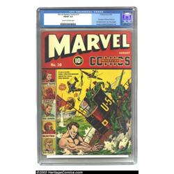 Marvel Mystery Comics #10 (Timely, 1940) CGC FN/VF 7.0 Cream to off-white pages. Alex Schomburg's brilliant cover has the Sub-Mariner destroying a sizable contingency of Nazi forces. Inside, the Human Torch and Subby are still fighting, and Terry Vance, Boy Detective, begins in this issue. Not quite Very Fine, this copy does display cover colors that would be at home on a higher-graded copy. Still, only two other unrestored copies of #10 have earned a higher grade, and at VF 8.0. They barely edged out our offering for the number one spot in CGC's census. Overstreet 2003 FN 6.0 value = $2,001; VF 8.0 value = $4,500. Important notice: Heritage usually auctions material at the rate of 200-250 lots per hour. On some occasions eBay Live bid software or the Internet may not be able to keep up with the pace of the auction. We recommend placing a realistic absentee bid now as insurance to avoid disappointment. Occasionally the auctioneer may eliminate or reject an eBay Live bid, and the auctioneer may also reopen a lot after the close of the eBay live bidding (usually because we missed an audience bid), and may reject your bid even if it shows you as the winning bidder. By bidding via eBay Live, you agree that Heritage may award the lot to another bidder at its sole discretion under the circumstances described above or any other reasonable circumstances. Also please note that all Heritage lots purchased through eBay Live carry a 20% Buyer's Premium. Please make sure you read the Terms and Conditions before you bid.