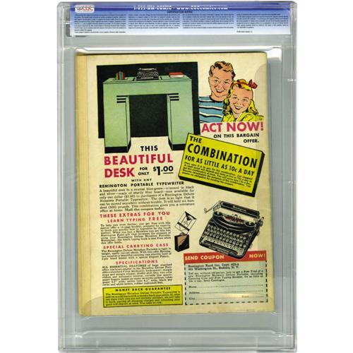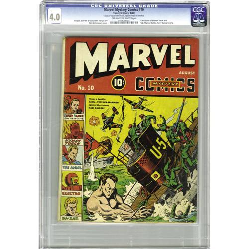 <B>Marvel Mystery Comics #10 (Timely, 1940) CGC VG 4.0 Off-white to white pages.</B></I> Arguably the single biggest event of the Timely years was the first Human Torch-Sub Mariner battle, which raged through issues #8 and #9 and concluded in this issue! The book also has the first appearance of Terry Vance, who would be a regular in this title. The issue's artists include Alex Schomburg (cover), Carl Burgos, Bill Everett, Paul Gustavson, and Bob Oksner. CGC notes, "5 pieces of tape on interior cover. 2 pieces of tape on centerfold." Overstreet 2006 VG 4.0 value = $1,696. CGC census 10/06: 1 in 4.0, 11 higher.<BR><BR><b>Shipping:</b> Slabbed Comic (<a target="_blank" href="http://www.heritageauctions.com/common/shipping.php">view shipping information</a>)