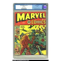 Marvel Mystery Comics #11 "D" Copy pedigree (Timely, 1940) CGC VF- 7.5 Cream to off-white pages. The Human Torch turns a Nazi tank into goo on this Alex Schomburg cover, as the baffled soldiers look on helplessly. Just imagine if we really did have the Torch on our side during the war! Carl Burgos, Bill Everett, and Paul Gustavson are among the interior contributing artists, working on features such as the Human Torch, Sub-Mariner, and the Angel. There are currently only three copies of this issue that have been graded higher by CGC, and one of them received a Qualified grade. Overstreet 2003 VF 8.0 value = $2,100. Important notice: Heritage usually auctions material at the rate of 200-250 lots per hour. On some occasions eBay Live bid software or the Internet may not be able to keep up with the pace of the auction. We recommend placing a realistic absentee bid now as insurance to avoid disappointment. Occasionally the auctioneer may eliminate or reject an eBay Live bid, and the auctioneer may also reopen a lot after the close of the eBay live bidding (usually because we missed an audience bid), and may reject your bid even if it shows you as the winning bidder. By bidding via eBay Live, you agree that Heritage may award the lot to another bidder at its sole discretion under the circumstances described above or any other reasonable circumstances. Also please note that all Heritage lots purchased through eBay Live carry a 20% Buyer's Premium. Please make sure you read the Terms and Conditions before you bid.