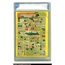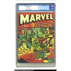 Marvel Mystery Comics #12 (Timely, 1940) CGC FN/VF 7.0 Cream to off-white pages. Jack Kirby's style is unmistakable, even as a young twenty-three year old, on this cover featuring the Angel coming to the aid of a green-pygmy harassed beauty. Overstreet rates it "classic." This is a high-grade appearing copy, especially from the front which displays rich reds and realistic alien green galore. It's not far behind CGC's top-rated copy to date which comes in at Very Fine Plus. Carl Burgos, Bill Everett, and Paul Gustavson add interior art. Overstreet 2002 FN 6.0 value = $1,125; VF 8.0 value = $2,344. Important notice: We expect to be auctioning lots at the rate of 200-250 per hour. Sometimes eBay Premier live bid software cannot keep up with that pace, so we strongly recommend that you place a realistic proxy bid now as insurance to avoid disappointment. Also please note that all Heritage/CAA lots purchased through eBay Premier carry a 20% Buyer's Premium. Please make sure you read the Terms and Conditions.