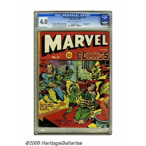<B>Marvel Mystery Comics #12 (Timely, 1940) CGC VG 4.0 Cream to off-white pages.</B></I> Overstreet calls Jack Kirby's cover ""classic."" Not only do we agree wholeheartedly with that, it makes us wish King Kirby had been a more prolific cover artist for Timely back in the Golden Age. Starring in the issue are the Sub-Mariner (by Bill Everett) and the Human Torch (by Carl Burgos). This is a much more appealing copy than the modest grade might indicate; it was evidently bumped down because of a water stain, but we had to look closely to notice the stain at all, and we think most collectors will agree. Overstreet 2005 VG 4.0 value = $800. CGC census 9/05: 1 in 4.0, 13 higher. <BR><BR><B>Important notice:</B> Heritage usually auctions material at the rate of 200-250 lots per hour. On some occasions eBay Live bid software or the Internet may not be able to keep up with the pace of the auction. We recommend placing a realistic absentee bid now as insurance to avoid disappointment. Occasionally the auctioneer may eliminate or reject an eBay Live bid, and the auctioneer may also reopen a lot after the close of the eBay live bidding (usually because we missed an audience bid), and may reject your bid even if it shows you as the winning bidder. By bidding via eBay Live, you agree that Heritage may award the lot to another bidder at its sole discretion under the circumstances described above or any other reasonable circumstances. Since eBay bids are not shown to us until we open the lot on the floor, we treat those bids just like floor bids. In most cases the floor responds before the eBay bid is presented to us, due to Internet lag time, so for consistency we have made it a policy that floor bids are always considered first over tie eBay live bids. Also please note that all Heritage lots purchased through eBay Live carry a 20% Buyer's Premium. Please make sure you read the Terms and Conditions before you bid. This lot is being auctioned in conjunction with a live floor aucti