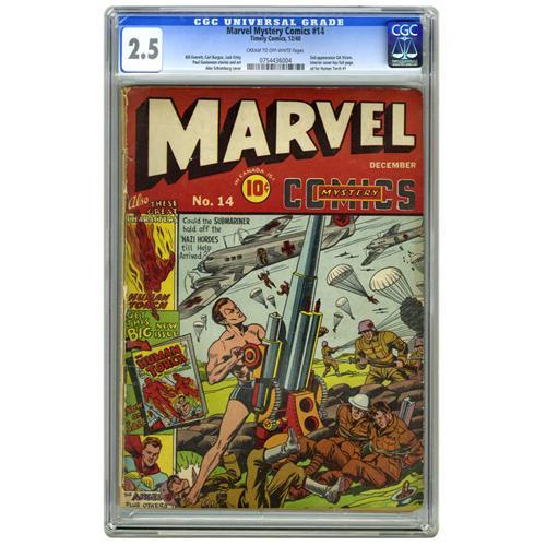 <B>Marvel Mystery Comics #14 (Timely, 1940) CGC GD+ 2.5 Cream to off-white pages.</B></I> Second appearance of the Vision. Alex Schomburg cover. Jack Kirby and Bill Everett art. Overstreet 2006 GD 2.0 value = $278. CGC census 4/06: 1 in 2.5, 15 higher.