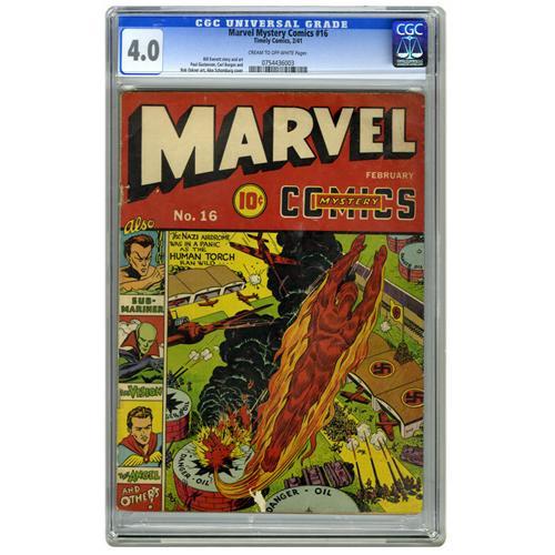 <B>Marvel Mystery Comics #16 (Timely, 1941) CGC VG 4.0 Cream to off-white pages.</B></I> You couldn't ask for a better array of characters and creators than this Golden Age Timely has to offer. A typically action-packed Schomburg cover starts things off in grand style, and inside these covers are all of the Timely big shots. There's the Sub-Mariner by Bill Everett, the Angel by Paul Gustavson, the Human Torch by Carl Burgos, the Vision by Jack Kirby (some sources call this a Simon and Kirby collaboration), and Terry Vance by Bob Oksner. A Ka-Zar story written and drawn by Ben Thompson rounds out the issue. Overstreet 2006 VG 4.0 value = $556. CGC census 4/06: 1 in 4.0, 6 higher.
