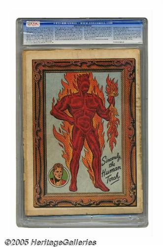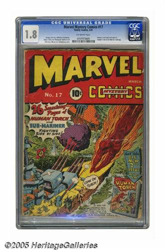 <B>Marvel Mystery Comics #17 (Timely, 1941) CGC GD- 1.8 Off-white pages.</B></I> The Human Torch and the Sub-Mariner team up in the same story. Alex Schomburg cover. Simon and Kirby, Bill Everett, Bob Oksner, and Carl Burgos art. Overstreet 2005 GD 2.0 value = $300. CGC census 5/05: 1 in 1.8, 10 higher.