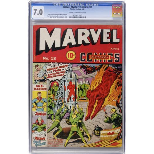 <B>Marvel Mystery Comics #18 (Timely, 1941) CGC FN/VF 7.0 Cream to off-white pages.</B></I> Alex Schomburg's actionfest cover shines brightly on this copy, with colors indicative of a higher grade. Inside art is provided by some of the most famous artists ever to draw for Timely: Simon and Kirby, Carl Burgos, Paul Gustavson, and Bill Everett. Overstreet 2006 FN 6.0 value = $777; VF 8.0 value = $1,619. CGC census 3/07: 4 in 7.0, 5 higher.<BR><BR><b>Shipping:</b> Comics - Slabbed (certified) (<a target=""_blank"" href=""http://www.heritageauctions.com/common/shipping.php"">view shipping information</a>)