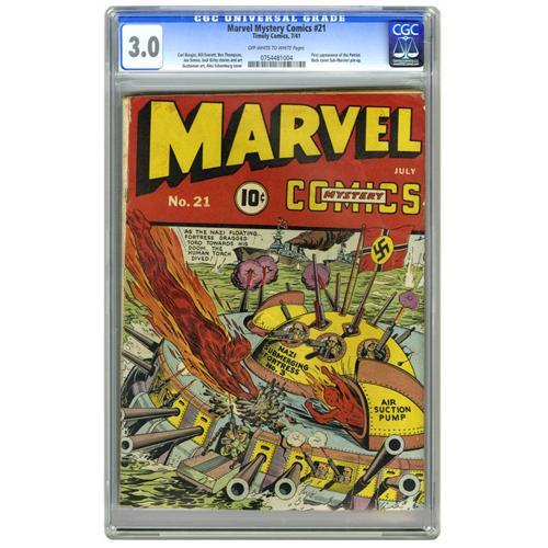 <B>Marvel Mystery Comics #21 (Timely, 1941) CGC GD/VG 3.0 Off-white to white pages.</B></I> All-out Alex Schomburg cover action makes this issue one to grab! Inside, the Patriot made his <B>Marvel Mystery</B></I> debut after just two appearances in the pages of <B>Human Torch</B></I> -- Timely's "other" patriotic hero would be a standby of this title for the next five years. Of course, big names like the Human Torch, the Sub-Mariner, the Angel, Ka-Zar, and the Vision are on hand as well, the latter drawn by the great Simon and Kirby team. Overstreet 2006 GD 2.0 value = $259; VG 4.0 value = $518. CGC census 4/06: in 3.0, higher.