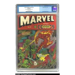 Marvel Mystery Comics #24 (Timely, 1941) CGC VF 8.0 Off-white pages. On this Alex Schomburg cover, the Human Torch and Toro face off against some of the ugliest baddies Marvel Mystery has ever seen, spraying acid all over the place. This copy has the fresh appearance and structural integrity of a pedigree comic, but may not command the price a "name" copy would. And with art by the likes of Carl Burgos, Bill Everett, Jack Kirby, Al Avison, and Sid Greene, what more could anyone ask for? CGC notes, "Very minor amount of color touch on cover." To date, only one copy of this issue has received a higher grade from CGC. Overstreet 2003 VF 8.0 value = $1,250. Important notice: Heritage usually auctions material at the rate of 200-250 lots per hour. On some occasions eBay Live bid software or the Internet may not be able to keep up with the pace of the auction. We recommend placing a realistic absentee bid now as insurance to avoid disappointment. Occasionally the auctioneer may eliminate or reject an eBay Live bid, and the auctioneer may also reopen a lot after the close of the eBay live bidding (usually because we missed an audience bid), and may reject your bid even if it shows you as the winning bidder. By bidding via eBay Live, you agree that Heritage may award the lot to another bidder at its sole discretion under the circumstances described above or any other reasonable circumstances. Also please note that all Heritage lots purchased through eBay Live carry a 20% Buyer's Premium. Please make sure you read the Terms and Conditions before you bid.