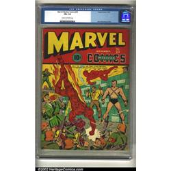 Marvel Mystery Comics #25 (Timely, 1941) CGC FN+ 6.5 Cream to off-white pages. "Only the Torch and Toro stood between the Submariner and the Nazi firing squad!" Schomburg was just gettin' warmed up on these early Marvel Mystery covers! A pretty copy, with a slight spine roll being the only defect. Overstreet 2002 FN 6.0 value = $573. Important notice: We expect to be auctioning lots at the rate of 200-250 per hour. Sometimes eBay Premier live bid software cannot keep up with that pace, so we strongly recommend that you place a realistic proxy bid now as insurance to avoid disappointment. Also please note that all Heritage/CAA lots purchased through eBay Premier carry a 20% Buyer's Premium.