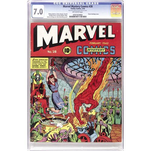 <B>Marvel Mystery Comics #28 (Timely, 1942) CGC FN/VF 7.0 Off-white pages. </B></I> This very strictly graded copy is sure to please, have a look at our scan and marvel for yourself! The bondage cover is an Alex Schomburg classic, and the kind of image that you'll only find in a pre-Code book (note the bones sticking out of the acid vat). The characters and artists in the issue include the Sub-Mariner by Bill Everett, the Vision by Simon and Kirby, Terry Vance by Bob Oksner, and the Human Torch by Carl Burgos. Plus, there's a text feature by Mike Hammer's creator and erstwhile comic scribe Mickey Spillane! CGC notes, "Very minor amount of color touch on cover." Overstreet 2006 FN 6.0 value = $621; VF 8.0 value = $1,294. CGC census 5/06: 2 in 7.0, 8 higher. <BR><BR><B>Important notice:</B> Heritage usually auctions material at the rate of 200-250 lots per hour. On some occasions eBay Live bid software or the Internet may not be able to keep up with the pace of the auction. We recommend placing a realistic absentee bid now as insurance to avoid disappointment. Occasionally the auctioneer may eliminate or reject an eBay Live bid, and the auctioneer may also reopen a lot after the close of the eBay live bidding (usually because we missed an audience bid), and may reject your bid even if it shows you as the winning bidder. By bidding via eBay Live, you agree that Heritage may award the lot to another bidder at its sole discretion under the circumstances described above or any other reasonable circumstances. Since eBay bids are not shown to us until we open the lot on the floor, we treat those bids just like floor bids. In most cases the floor responds before the eBay bid is presented to us, due to Internet lag time, so for consistency we have made it a policy that floor bids are always considered first over tie eBay live bids. Also please note that all Heritage lots purchased through eBay Live carry a 22.5% Buyer's Premium. Please make sure you read the Terms and Conditions before you bid. This lot is being auctioned in conjunction with a live floor auction by Heritage Auction Galleries. All final auction and invoice information will be supplied by Heritage Auction Galleries, and all other information should be considered preliminary. Lot:41001 <BR><BR><B>Winning Notification and Billing:</B> After the FINAL session in this auction is complete, Heritage will send e-mail and snail mail invoices. This process normally takes several days. All final auction and invoice information will be supplied by Heritage Auction Galleries, and all other information should be considered preliminary. <BR><BR>This auction will be conducted on a live auction floor and over the Internet through eBay Live. If you choose to place an absentee bid, please take a moment to <font color='#0000ff'><u><a href='http://pages.ebay.com/liveauctions/help/before/laabsentee.html'>learn how eBay Live absentee bidding works</a></u></font><font color='#000000'>