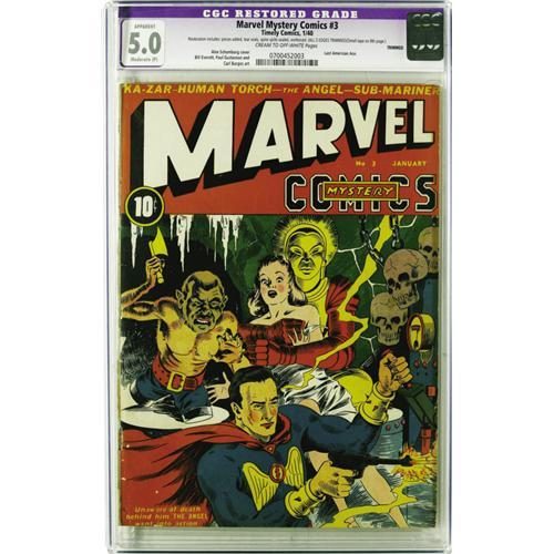 <B>Marvel Mystery Comics #3 (Timely, 1940) CGC Apparent VG/FN 5.0 Moderate (P) Cream to off-white pages.</B></I> High-grade unrestored copies of this book are few and far between, with only two appearing on the CGC census to date. So if you're not one of the two collectors lucky enough to own those books, take a look at this professionally restored copy. This issue has the distinction of being the first <B>Marvel Mystery</B></I> to have an Alex Schomburg cover. Inside the comic, Bill Everett, Carl Burgos, and Paul Gustavson rendered their creations Sub-Mariner, Human Torch, and the Angel, respectively. Overstreet speculates that the Human Torch story may be the first time a television was shown in a comic book story! Also of note is an early Ka-Zar appearance. CGC notes, "Restoration includes: pieces added, tear seals, spine splits sealed, reinforced. All 3 edges trimmed. Small tape on 8th page." Overstreet 2006 GD 2.0 value = $1,389; VG 4.0 value = $2,778; FN 6.0 value = $4,167. <BR><BR><B>Important notice:</B> Heritage usually auctions material at the rate of 200-250 lots per hour. On some occasions eBay Live bid software or the Internet may not be able to keep up with the pace of the auction. We recommend placing a realistic absentee bid now as insurance to avoid disappointment. Occasionally the auctioneer may eliminate or reject an eBay Live bid, and the auctioneer may also reopen a lot after the close of the eBay live bidding (usually because we missed an audience bid), and may reject your bid even if it shows you as the winning bidder. By bidding via eBay Live, you agree that Heritage may award the lot to another bidder at its sole discretion under the circumstances described above or any other reasonable circumstances. Since eBay bids are not shown to us until we open the lot on the floor, we treat those bids just like floor bids. In most cases the floor responds before the eBay bid is presented to us, due to Internet lag time, so for consistency we have made it a policy that floor bids are always considered first over tie eBay live bids. Also please note that all Heritage lots purchased through eBay Live carry a 22.5% Buyer's Premium. Please make sure you read the Terms and Conditions before you bid. This lot is being auctioned in conjunction with a live floor auction by Heritage Auction Galleries. All final auction and invoice information will be supplied by Heritage Auction Galleries, and all other information should be considered preliminary. Lot:41001 <BR><BR><B>Winning Notification and Billing:</B> After the FINAL session in this auction is complete, Heritage will send e-mail and snail mail invoices. This process normally takes several days. All final auction and invoice information will be supplied by Heritage Auction Galleries, and all other information should be considered preliminary. <BR><BR>This auction will be conducted on a live auction floor and over the Internet through eBay Live. If you choose to place an absentee bid, please take a moment to <font color='#0000ff'><u><a href='http://pages.ebay.com/liveauctions/help/before/laabsentee.html'>learn how eBay Live absentee bidding works</a></u></font><font color='#000000'>
