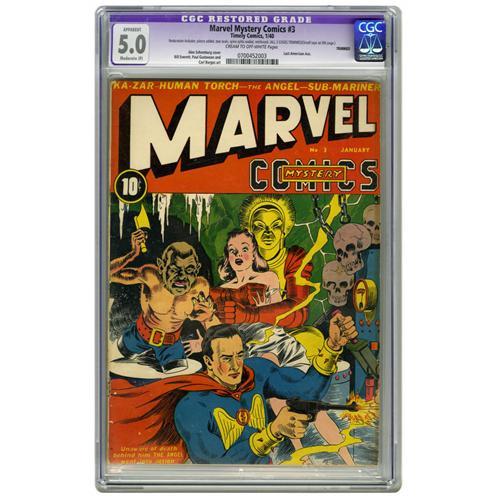 <B>Marvel Mystery Comics #3 (Timely, 1940) CGC Apparent VG/FN 5.0 Moderate (P) Cream to off-white pages.</B></I> High-grade unrestored copies of this book are few and far between, with only two appearing on the CGC census to date. So if you're not one of the two collectors lucky enough to own those books, take a look at this professionally restored copy. This issue has the distinction of being the first <B>Marvel Mystery</B></I> to have an Alex Schomburg cover. Inside the comic, Bill Everett, Carl Burgos, and Paul Gustavson rendered their creations Sub-Mariner, Human Torch, and the Angel, respectively. Overstreet speculates that the Human Torch story may be the first time a television was shown in a comic book story! Also of note is an early Ka-Zar appearance. CGC notes, "Restoration includes: pieces added, tear seals, spine splits sealed, reinforced. All 3 edges trimmed. Small tape on 8th page." Overstreet 2006 GD 2.0 value = $1,389; VG 4.0 value = $2,778; FN 6.0 value = $4,167.