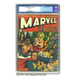 Marvel Mystery Comics #3 (Timely, 1940) CGC GD+ 2.5 Off-white pages. This is the issue that borrows the familiar "Marvel" logo from their pulp magazine series of the same name. Alex Schomburg does the cover art, which shows the Angel oblivious to the danger of a hatchet-wielding amputee who's sneaking up behind him, while a helpless woman looks on, mute with terror. Overstreet suggests that the Human Torch story in this issue may have the first appearance of a television in comics. This low grade copy is complete and attractive, just begging to be cracked out of its CGC holder and read! Overstreet 2003 GD 2.0 value = $1,133. Important notice: Heritage usually auctions material at the rate of 200-250 lots per hour. On some occasions eBay Live bid software or the Internet may not be able to keep up with the pace of the auction. We recommend placing a realistic absentee bid now as insurance to avoid disappointment. Occasionally the auctioneer may eliminate or reject an eBay Live bid, and the auctioneer may also reopen a lot after the close of the eBay live bidding (usually because we missed an audience bid), and may reject your bid even if it shows you as the winning bidder. By bidding via eBay Live, you agree that Heritage may award the lot to another bidder at its sole discretion under the circumstances described above or any other reasonable circumstances. Since eBay bids are not shown to us until we open the lot on the floor, we treat those bids just like floor bids. In most cases the floor responds before the eBay bid is presented to us, due to Internet lag time, so for consistency we have made it a policy that floor bids are always considered first over tie eBay live bids. Also please note that all Heritage lots purchased through eBay Live carry a 20% Buyer's Premium. Please make sure you read the Terms and Conditions before you bid.